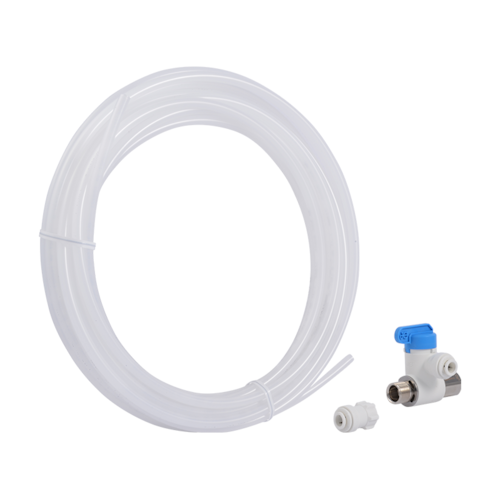 The John Guest ice maker water supply kit provides an easy, leak-free, and reliable connection to your ice maker. The kit incorporates an angle stop adapter valve with John Guest push-to-connect technology which installs in no time onto an existing under sink water supply valve. Packaging includes easy to follow installation instructions and a QR code to an instructional "how to install" video. Kit contains: 1/4 in. O.D. x 3/8 in. male compression x 3/8 in. female compression angle stop adapter valve, 1/4 in. O.D. connector, and 25 ft. of 1/4 in. polyethylene tubing.